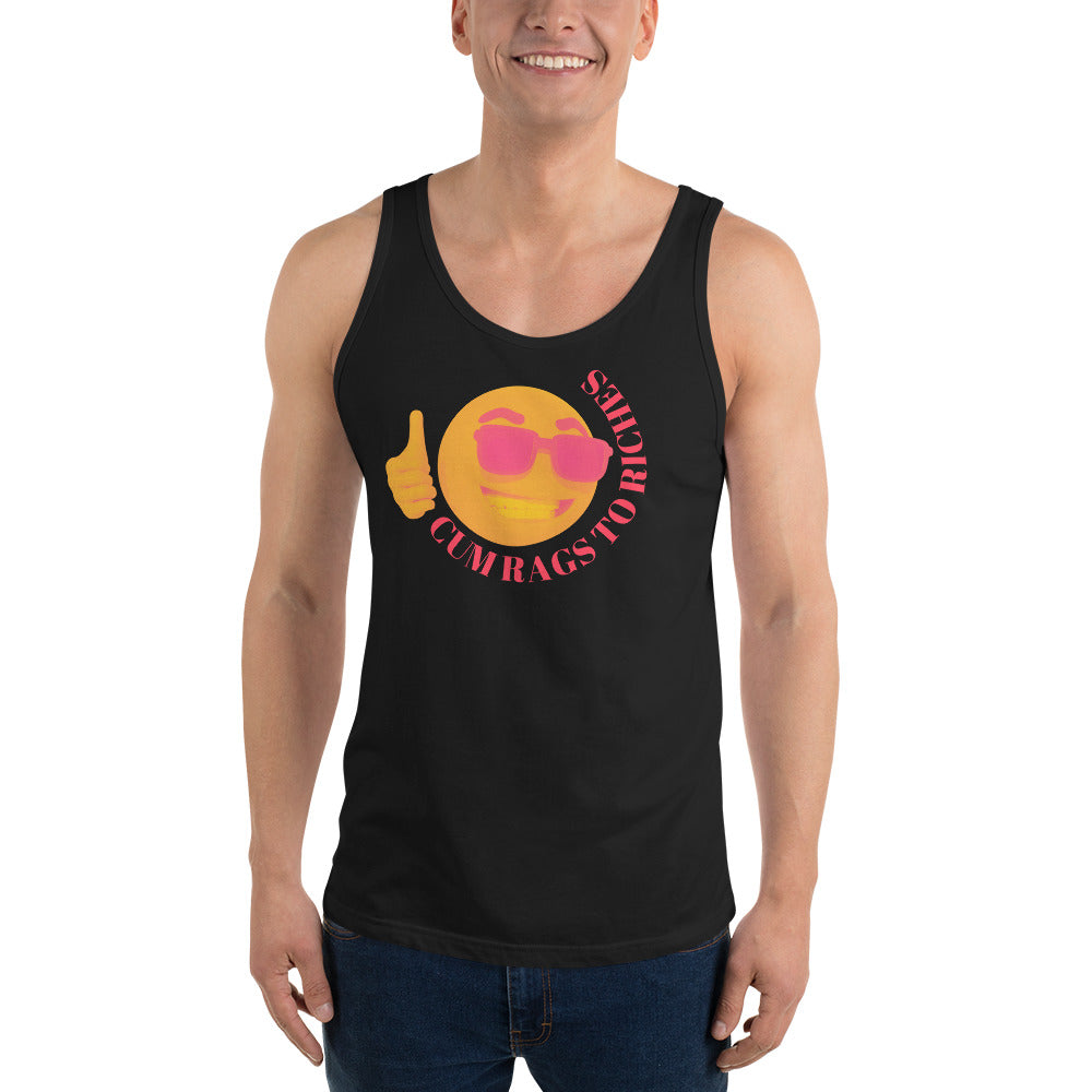 Our "Cum Rags To Riches" tank top is designed for those who appreciate humor with a daring edge. This tee combines audacity with a playful twist on the classic rags-to-riches story.